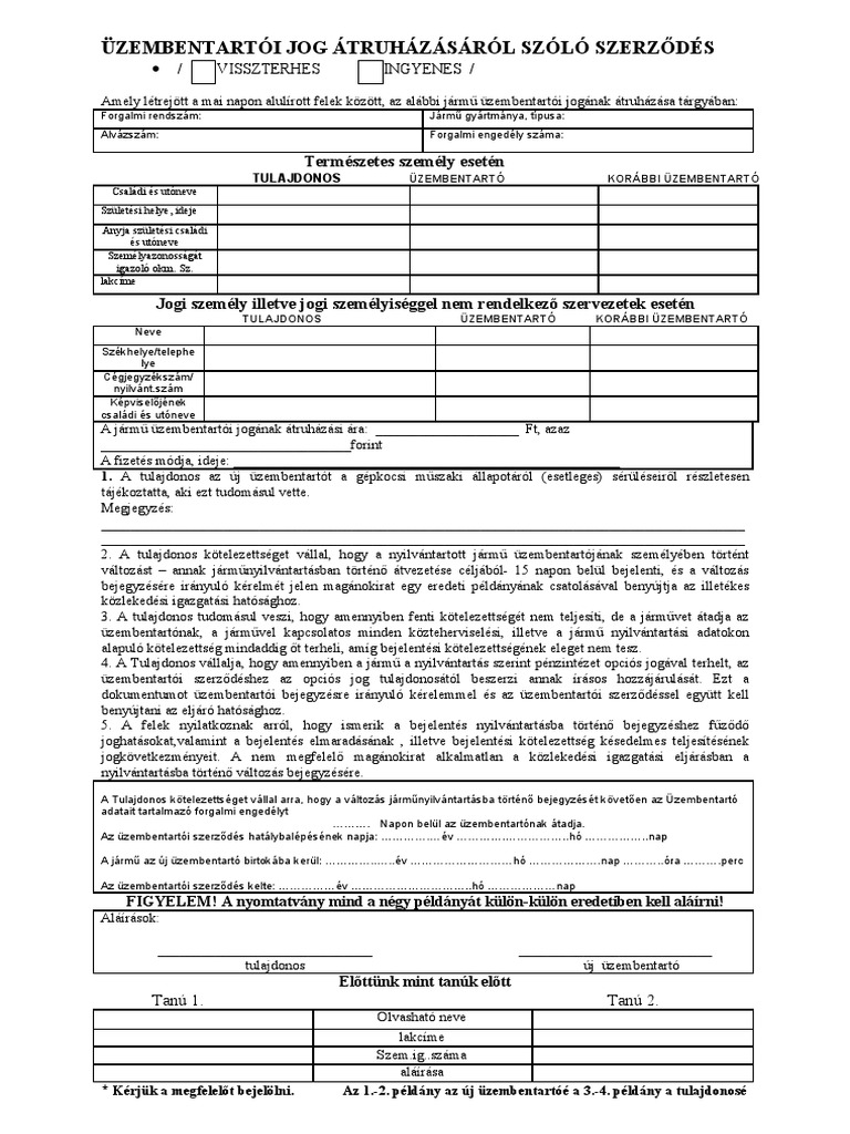 üzembentartói Jog átruházásáról Szóló Szerződés